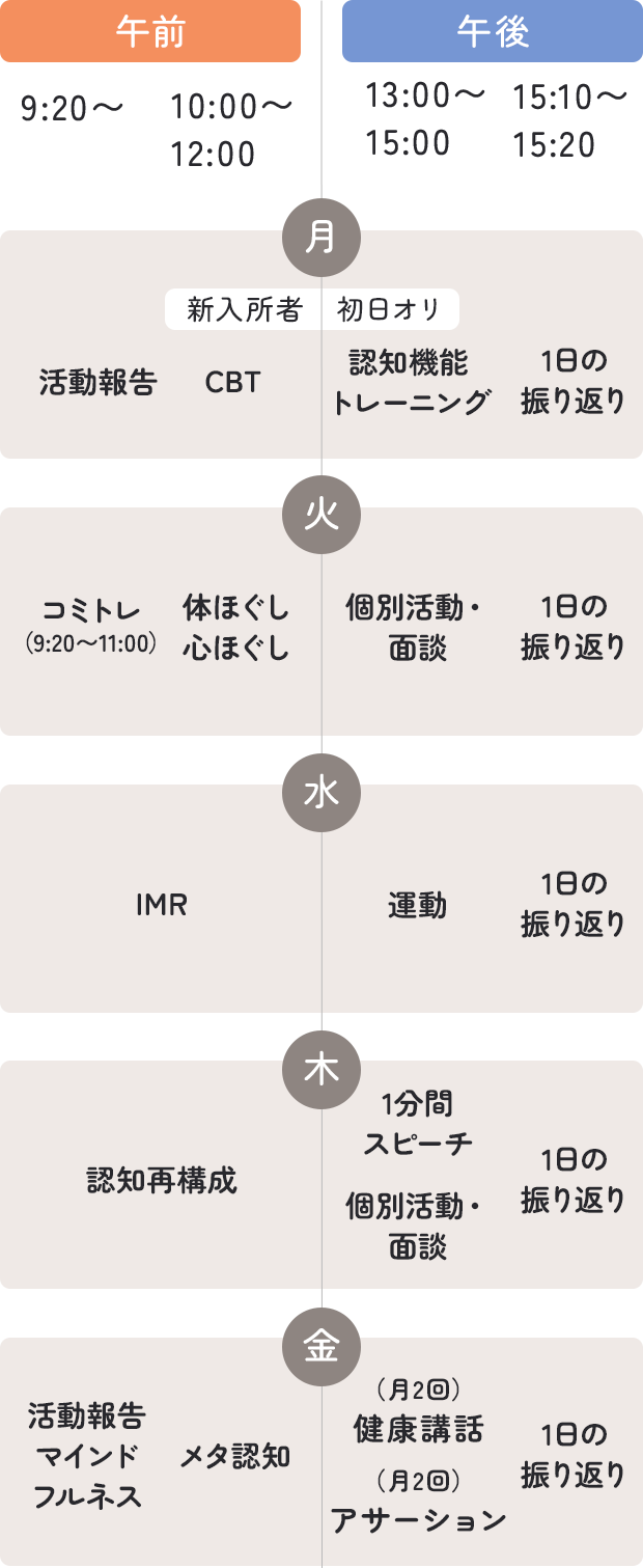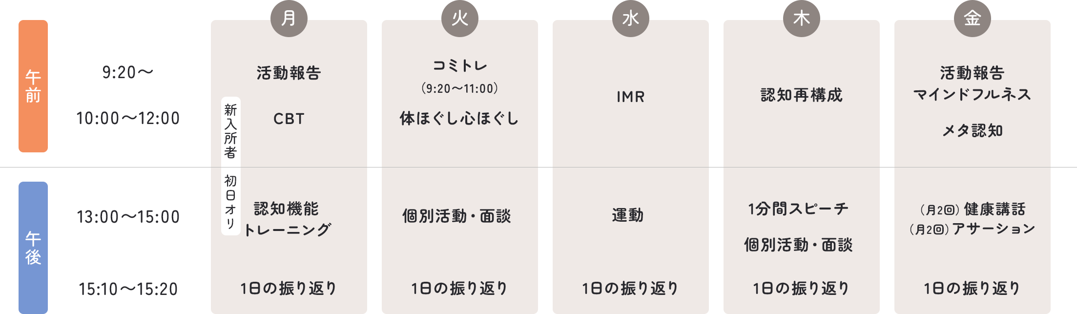 復職支援に向けた準備段階として、生活リズムの安定や通所する習慣を定着させる個別性の高いプログラムで、負担なくリワークへ移行できます。